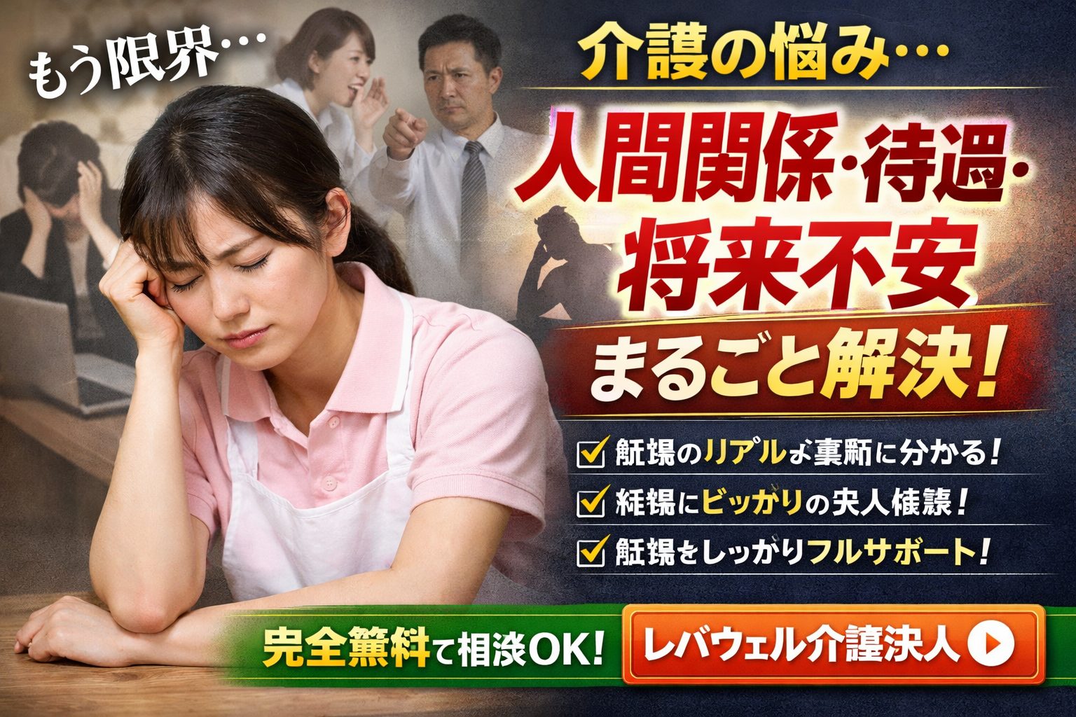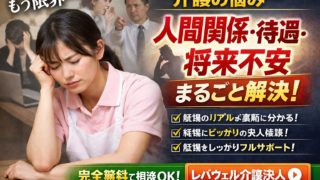 介護職で**「人間関係・待遇・将来不安」に悩んでいるなら、「レバウェル介護求人」**を使うことで、その悩みはほぼ解決できます。